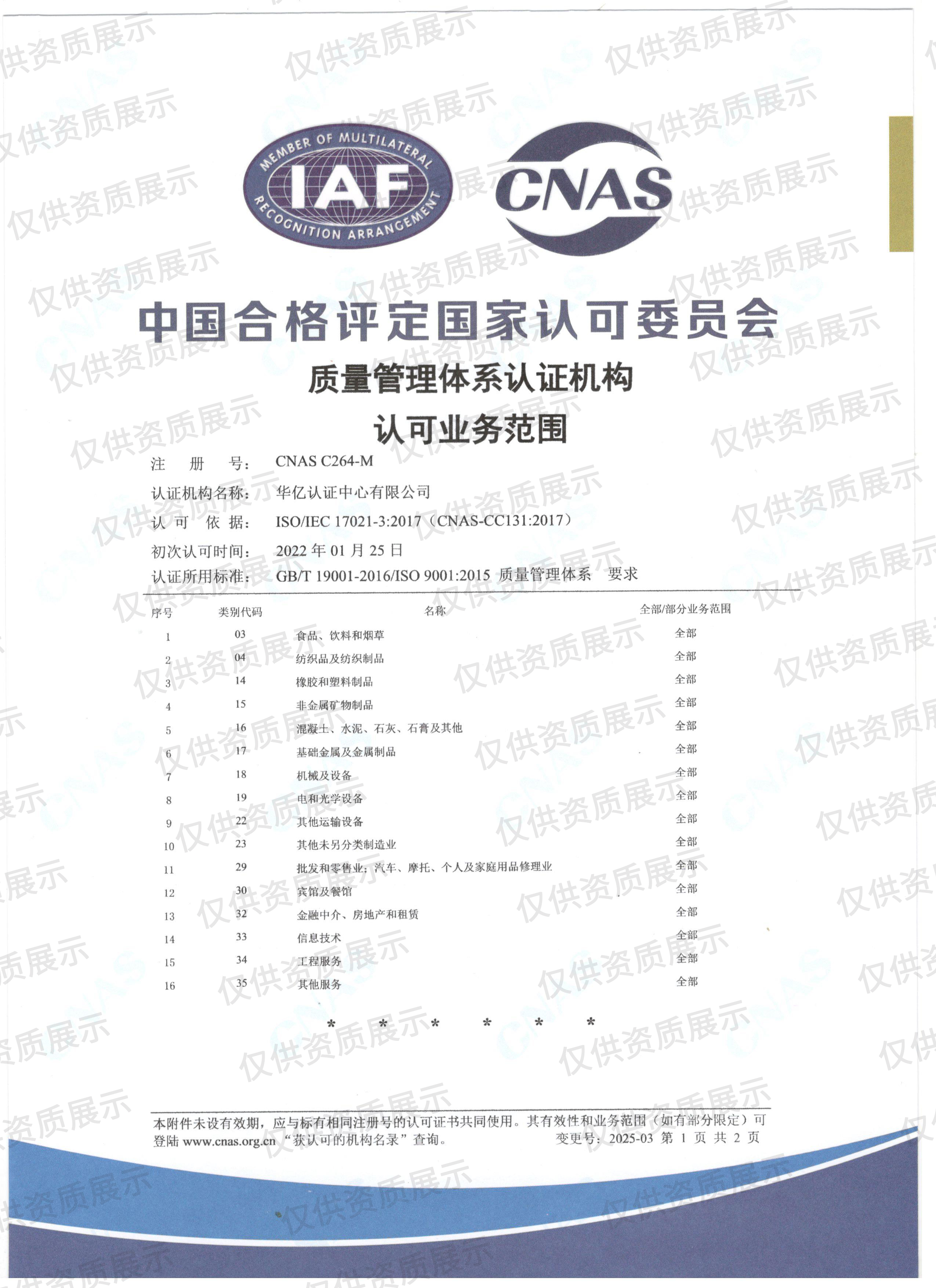 CNAS质量管理体系认证机构认可业务范围